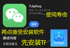 TF证书安装的软件一定会需要先安装TestFlight,这是安装软件的载体,安装的时候界面也会显示到期时间,一般是80~90天,很多骗子会说不用看这个时间,只是一个安装时间来忽悠你,你一定要知道,这个时间就是使用寿命,看准别被骗! 如下图